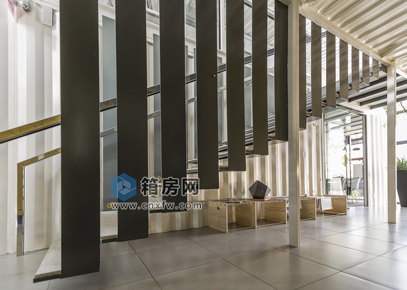 一層是會客室、會議室和公共休閑空間:硅鈣板覆蓋了大部分的墻面,掩蓋了集裝箱自帶的波浪板;中間是鋼架構連通的玻璃幕墻,中空部分種上了植物,環境優美,光線充足;帶有半戶外走廊,空間充足。