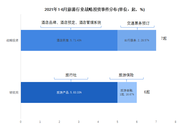 戰略投資與收購事件中涉及不同的旅游行業細分領域:旅游行業的戰略投資事件僅與出行服務和酒店民宿相關,而收購事件所涉及的旅游行業細分領域與戰略投資事件的截然不同,為旅游產品和旅游金融。在戰略投資事件中的融資方為酒店品牌、酒店預訂APP、酒店管理系統開發者和交通票務預定APP;在收購事件中的融資方則為旅行社和旅游保險平臺。