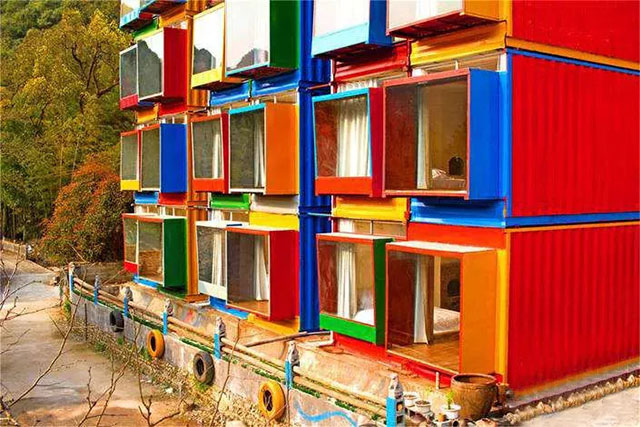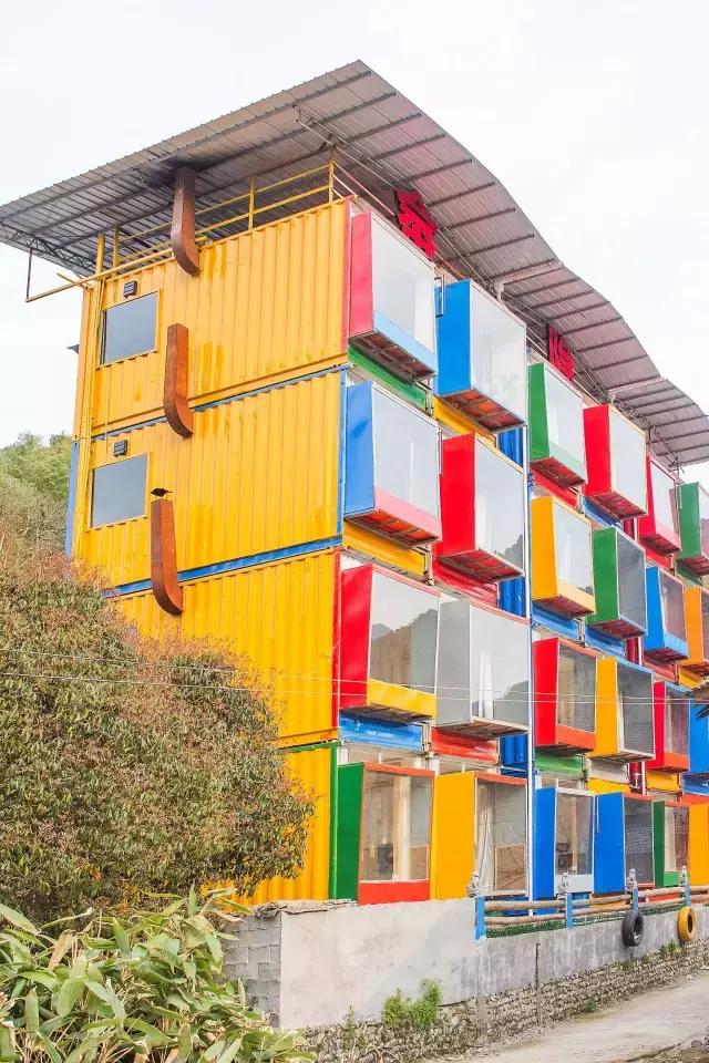 初見(jiàn)畬隱就有一種驚艷的感覺(jué),畬隱的客房由12個(gè)集裝箱組成,外表被涂成七色彩虹,遠(yuǎn)遠(yuǎn)望去猶如架在山水田園間的彩虹橋,達(dá)到了工業(yè)風(fēng)和田園風(fēng)的完美結(jié)合。