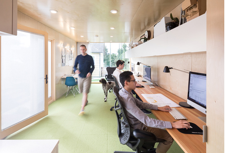 辦公室加裝了黃色雪松壁板,窗戶和門也是由黃色雪松制成,留下灰色銅綠干燥。內(nèi)部襯有樺木膠合板以傳遞溫暖,5.7米長的俄勒岡松木辦公桌提供了一個(gè)非常靈活的工作空間。