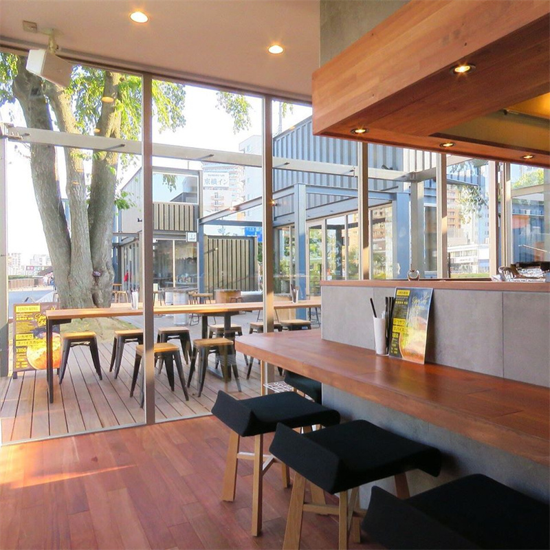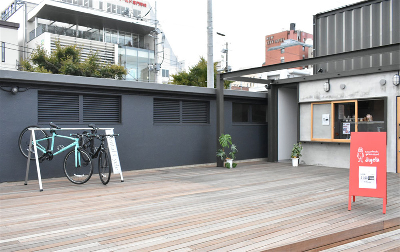 繼續(xù)往前走,你會(huì)得到一個(gè)木甲板鋪設(shè)的小露臺(tái),這里正好是一顆在此生長(zhǎng)的大樹(shù),集裝箱建筑在此繞開(kāi)的位置造就了這個(gè)可用于戶外休閑就餐的小廣場(chǎng),還能蹭到乘涼的樹(shù)蔭。