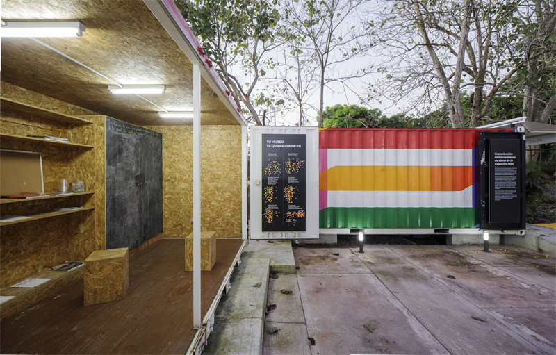 當(dāng)大門關(guān)閉的時(shí)候,它是兩個(gè)神秘的七彩盒子,箱壁上涂滿了重疊著的幾何圖案,并以不同的顏色區(qū)分層次;當(dāng)它大門敞開(kāi)的時(shí)候,展示的是一個(gè)原木內(nèi)壁的教育工作坊和一個(gè)灰色內(nèi)壁的陳列空間。