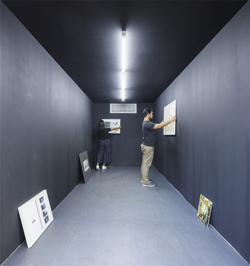工作坊打開(kāi)的箱門粘貼著宣傳海報(bào),同時(shí)連接著旁邊的陳列室。地上佇立著一些小燈柱,沿著這些燈柱過(guò)來(lái)就可以到達(dá)仍由集裝箱側(cè)邊門打開(kāi)的陳列室。灰色的內(nèi)壁更有利于作品的展示,頂部連著的燈管也保證了室內(nèi)良好的光照效果。