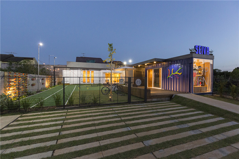 集裝箱在地皮上的布局是經過深刻考慮的,采用橫向封閉,將其中一個藍色容器放置在陸地的極限處,充當阻擋南方強風的屏障。另外兩個容器,一個12m和一個6m(由12m的一個劃分)則位于另外兩個方位,由此構成戶外訓練區域。戶外訓練場已經用天然和人造草處理過,一些運動設施建設在集裝箱前。地下管道可以排出雨水并將這些水存儲在下部的水庫中,以便可以在衛生間、菜園和園林綠化中再利用。其中,菜園就是一面被改造成有機花園的隔離墻。
