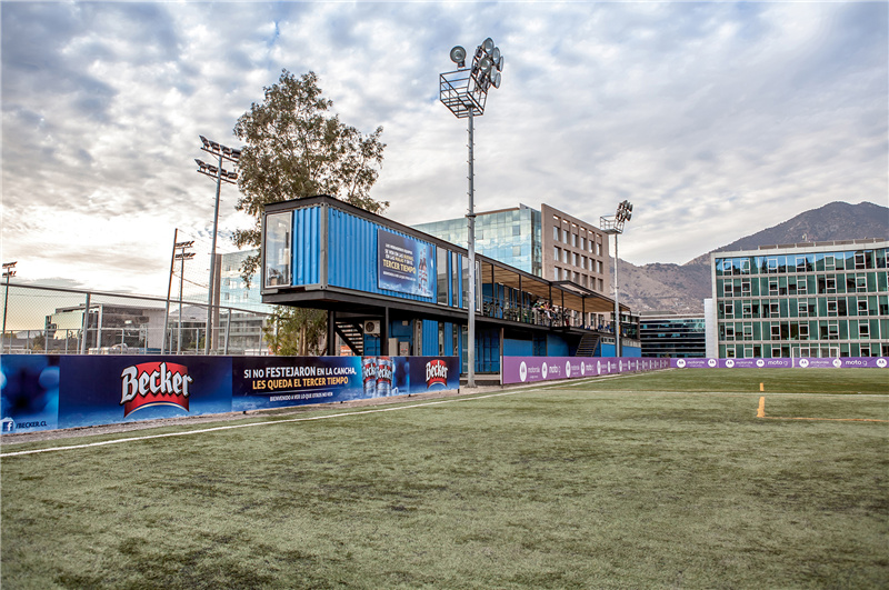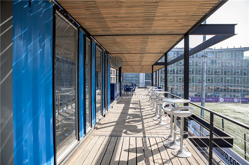 一個獨特的集裝箱建筑,能夠為這個城市提供一個休閑大氣的生活形象,反過來又與商業環境的復雜和發展方式形成對照。集裝箱是一種貨物裝載工具,現在用于體育休閑空間,這家體育場為了讓人們有更好的觀賽體驗,建立了一個以集裝箱為主體的球場觀賽區域。每一個集裝箱都在工廠內完場打磨、上漆,樓梯與鋼結構都是現場搭建,與集裝箱完美的結合在一起。