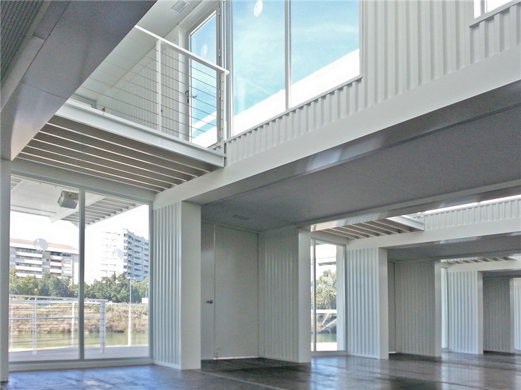 該項(xiàng)目在建筑形態(tài)上的構(gòu)成,是先將高立方體集裝箱平行排列,再將標(biāo)準(zhǔn)集裝箱放置在其上,起到天窗的作用。這里的空間既有單層也有雙層,波浪狀金屬墻面將模塊化的結(jié)構(gòu)暴露在外,為在這里舉辦的活動(dòng)創(chuàng)造了具有吸引力而又適宜的空間。