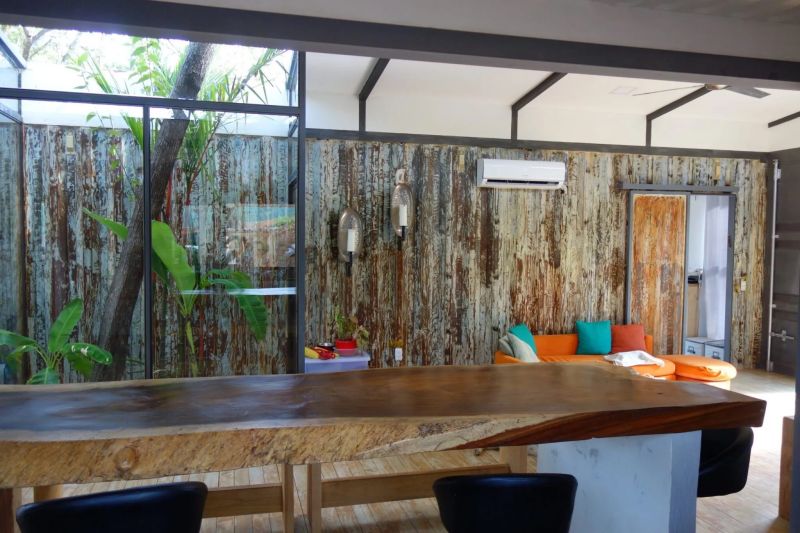 這座美麗的集裝箱房屋建設在4000平方米的土地上,房屋周圍環繞著一條60平方米(645平方英尺)的游廊,鋪設干爽的原木地板,放置簡易的餐桌椅,住戶可以在此放松身心,享受愉快的寧靜時光。