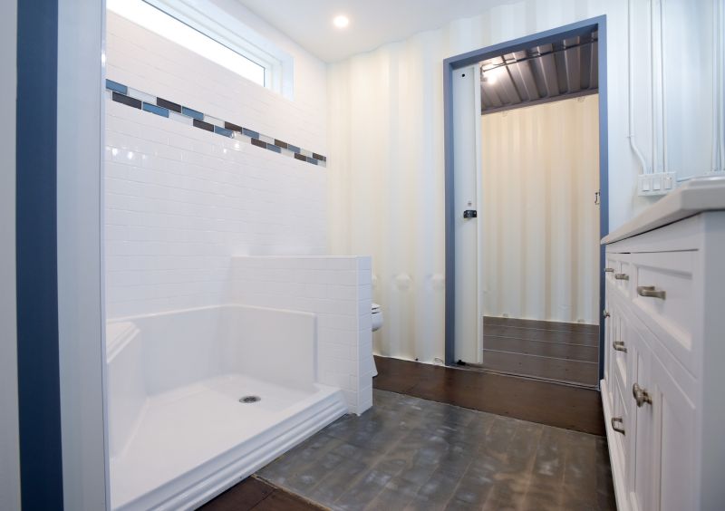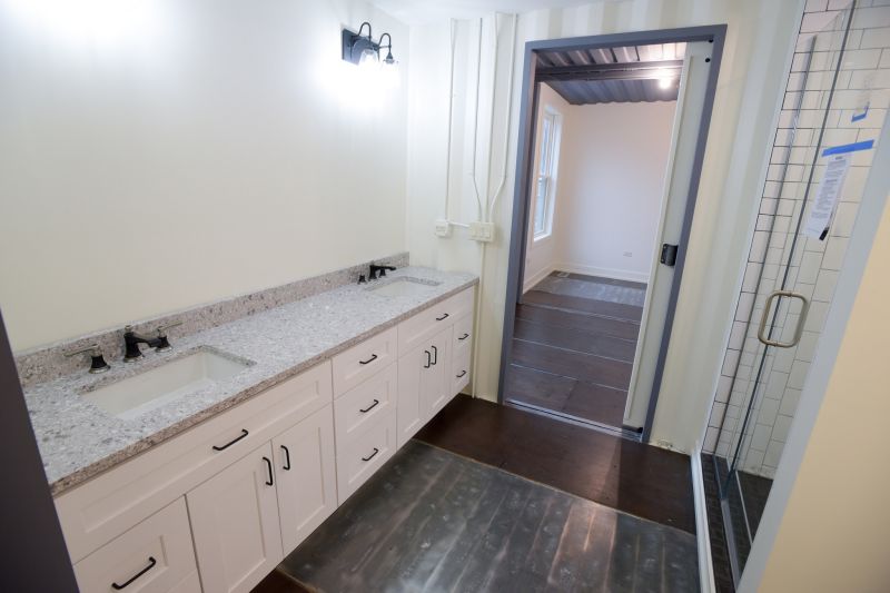 衛(wèi)浴室的設(shè)計(jì)十分明亮且寬敞,連洗漱臺(tái)都擁有并排的兩個(gè),同時(shí)全白的色調(diào)為空間帶來(lái)整潔的視覺(jué)感。進(jìn)入浴間,你可以全方位感受到集裝箱內(nèi)部的結(jié)構(gòu),墻面鋪設(shè)的瓷磚則可以有效防潮。