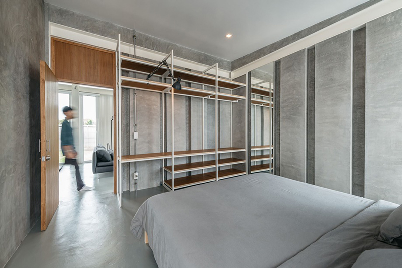 房間的墻壁看似普通的裸露石膏,但其實(shí)是模仿容器波紋表面設(shè)計(jì)的。隱藏在以簡約風(fēng)格裝飾的簡單木門后面的臥室,里面只有一張床,床和床尾區(qū)域的金屬架子,可用于儲物或桌子。以及一個簡約大氣的衛(wèi)生間。