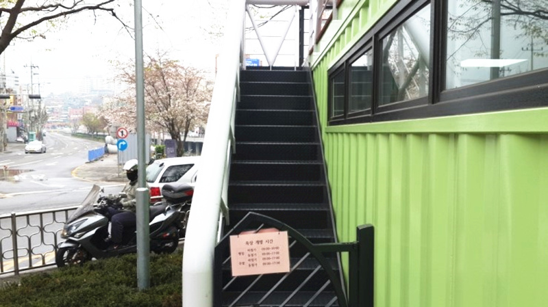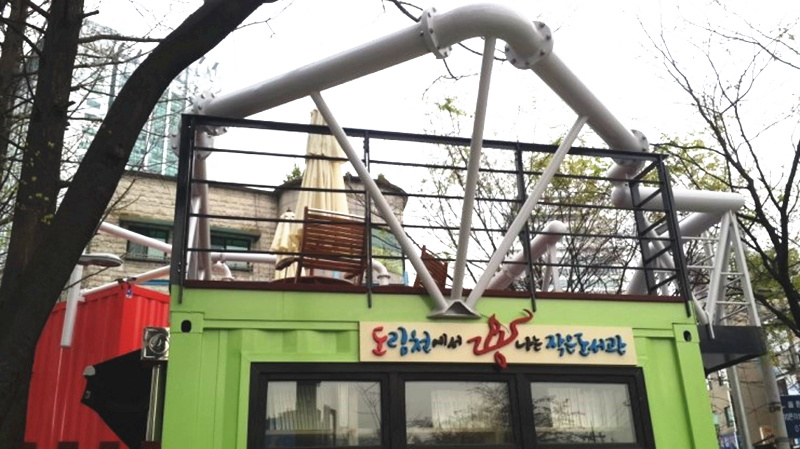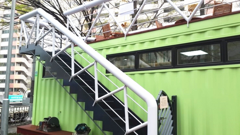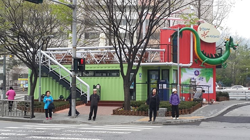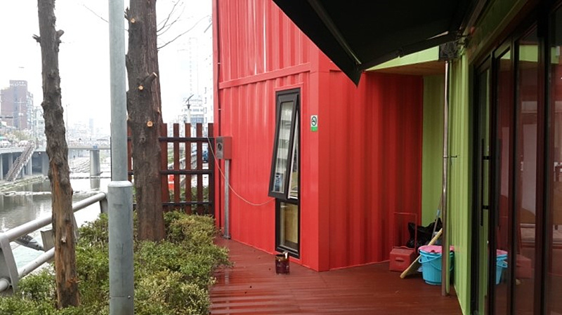 位于韓國的小龍圖書館由三只集裝箱組合而成,綠色集裝箱是由40尺集裝箱組成,是一個(gè)借閱圖書的地方;而紅色箱體是由兩只10尺的集裝箱組成,是一個(gè)休息室。