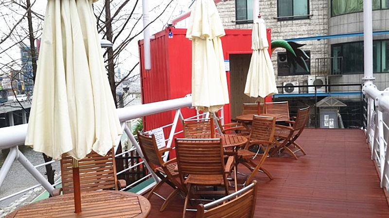 在綠色集裝箱的頂部作了結(jié)構(gòu)加固,并搭建了一個(gè)休閑陽臺(tái)。棕色的戶外木地板搭配同色系的桌椅,讓人感覺十分親近自然。
