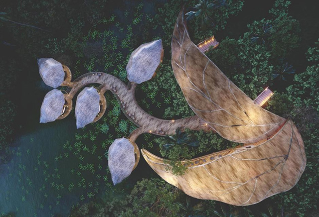 野奢的“奢”字,既指生活于自然之境的奢侈,也在強調(diào)硬件設(shè)施的品質(zhì)。風(fēng)餐露宿、日曬雨淋的戶外出游方式,只會將“出游”變成“吃苦”,旅途中非但得不到放松,身體反而更加疲憊了。因此,“奢”的意義就在于讓人們能夠安逸地去享受自然之野。但高品質(zhì)的酒店、民宿雖不難尋,可要想在自然之景中建設(shè)酒店、民宿,現(xiàn)代都市化的建筑就多少有些格格不入了。自然的美景是無與倫比的,好的野奢酒店設(shè)計,當是自然美景的“點睛之筆”,是從自然中“生長”出來的,而非突兀地佇立其中。