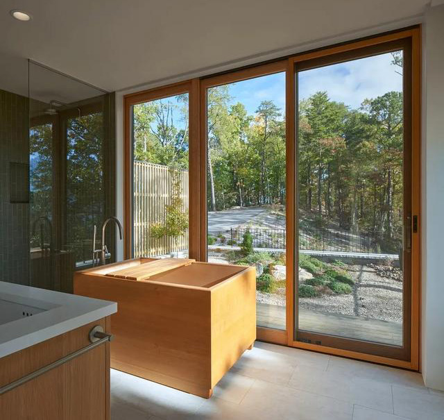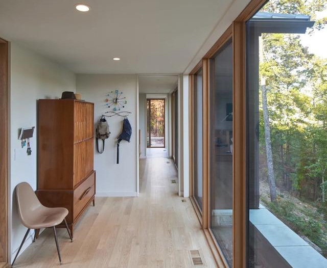 傳統日本房屋的一個顯著特征是使用了engawa,這是一種有頂覆蓋的連廊,通常用木材完成,沿著房屋的外圍延伸,作為房屋和花園之間的過渡。每個屋子在從內部空間到外部空間的過渡處都融入了單獨的engawa空間。這些有蓋門廊還通過在engawas的大型滑動玻璃門上方伸出懸挑,以幫助控制太陽熱能照射。