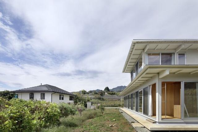 這座木屋別墅位于日本山梨縣山梨市北部,周圍被葡萄園環繞,在房子中可以遠眺甲府盆地和富士山的全景。木屋位于山腳的一個角落,總面積920 m2,其中470 m2用于建筑,450 m2用于葡萄園。這是一棟兩層的木結構建筑,總建筑面積為123 m2,建筑面積為92 m2。