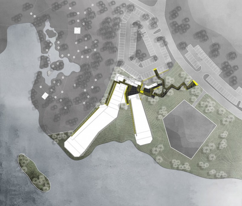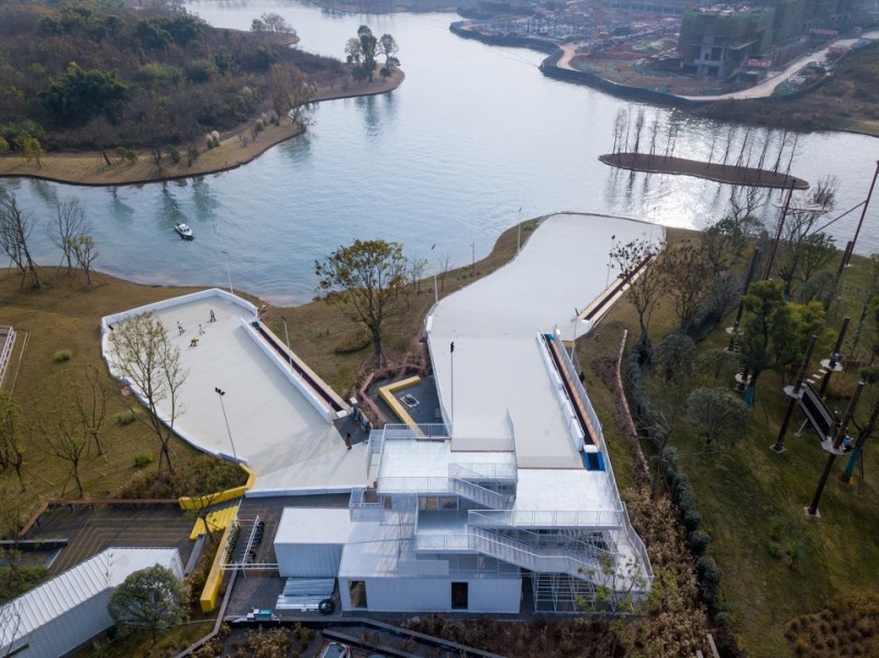 由于項目臨湖,旱雪滑道的布置與湖岸線垂直,將朝著湖岸方向“滑雪沖刺”的過程作為項目的核心體驗。采用兩根滑道分行的方式,由統一的前場準備區進入,一邊是直接接入的初級道,方便小朋友穿著雪鞋不用穿行太遠距離;一邊是通過搭接的腳手架構筑平臺,上升到與湖面高差15米的中級道出發平臺,體驗更有速度的滑行感。